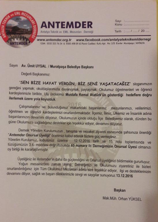 Başkan Yardımcısı sayın İbrahim Cephaneci ile birlikte Okulumuz Mezunu, derneğimiz Üyesi Muratpaşa CHP İlçe Başkanı sayın Ahmet Kumbul ve ekibi ile birlikte Derneğimize İade i zayarette bulunan sayın Uysal'a Derneğimize 65 Numara ile onursal üyeliğine ait karar yazısı takdim edildi.