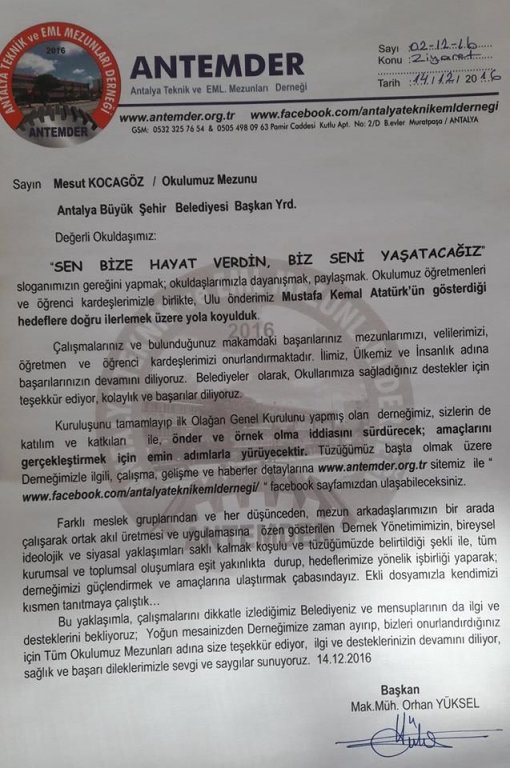 Okulumuz mezunlarından Derneğimiz Üyesi, Antalya Büyükşehir Belediye Başkan Yardımcısı sayın Mesut KOCAGÖZ'ü makamında ziyaret ettik.