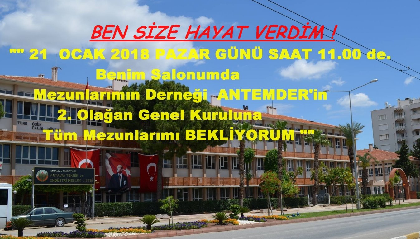 Antalya’nın 1944 yılında açılmış ilk Meslek Okulu olan, okulumuzun Mezunlar Derneği ANTEMDER’in gelişerek büyütülmesi için, Üyelerimizi, Mezunlarımızı, öğretmen ve öğrencilerimizi , okulumuzu seven tüm dostlarımızı GENEL KURULUMUZA ÇAĞIRIYORUZ. SEVGİLERİMİZLE 20.12.2017