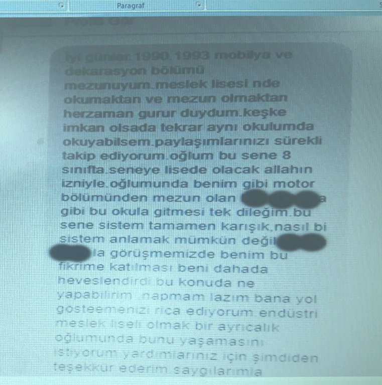 Bu kapsamda ilk olarak, bizzat okulumuz mobilya bölümü mezunlarımızdan okuldaşımız bir annenin derneğimiz facebook sayfasından yolladığı ve ekte örneğini de göreceğiniz mesajından hareket ile: Bağlantılı Beş Temel konuyu da içeren öneri ve taleplerimizi yansıtan raporumuz ekte size sunulmaktadır.