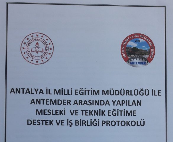 1944 YILINDA AÇILAN Geçen hafta 75. Kuruluş Yıl Dönümünü Törenlerle kutlayan Antalya'nın İlk Meslek Okulu Antalya Mesleki ve Teknik Anadolu Lisesi'nin MEZUNLAR DERNEĞİ ANTEMDER, 3 Yıldır Okullarında uygulamaya koyduğu OKULA DÖNÜŞ PROJESİNİ İlimizdeki muadili diğer Meslek Okullarına da yaygınlaştırarak Antalya da Mesleki Teknik Eğitimin gelişimine katkı sağlamak için Antalya İl Milli Eğitim Müdürlüğü İle ANTEMDER arasında " MESLEKİ ve TEKNİK EĞİTİME DESTEK VE İŞ BİRLİĞİ PROTOKOLÜ" imzaladı.