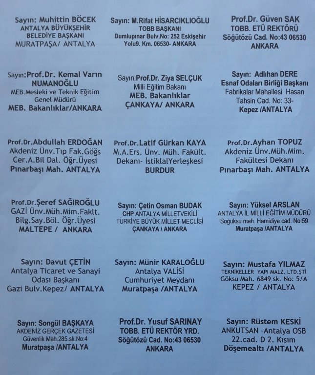 Bu kapsamda aşağıdaki Başvuru metnini, Protokolün tarafları olan Milli Eğitim Bakanımıza, Mesleki ve Teknik Eğitim Genel Müdürümüze, TOBB ETÜ Rektörü ve Yardımcısına, mezunumuz ve Dernek üyemiz ATSO Başkanı Davut ÇETİN, mezunumuz ve Dernek üyemiz Antalya Milletvekili Çetin Osman Budak ile birlikte ekli fotoğraf listede isimleri bulunan bazı mezunlarımıza bilgi ve ilgileri için 06.05.2019 tarihle PTT aracılığı ile gönderdik.