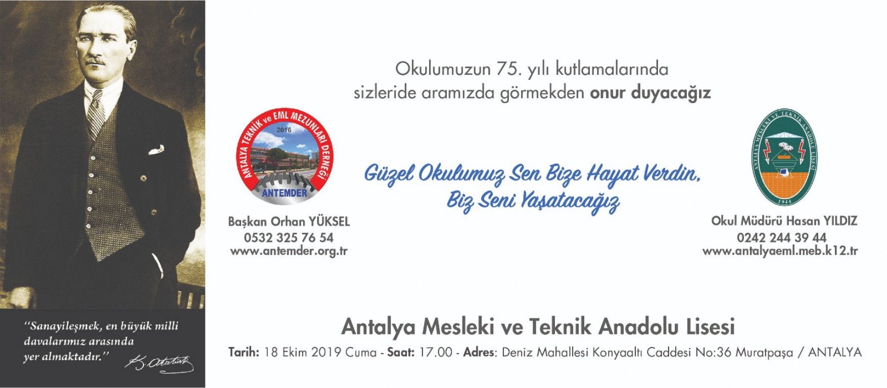 Antalya’mızın hafızalarından, Konyaaltı Caddesinin Eğitim Çınarı, Endüstri Meslek Lisesi; Bu günkü adı ile Antalya Mesleki ve Teknik Anadolu Lisesi “ 75. KURULUŞ YILI “nı kutluyor.