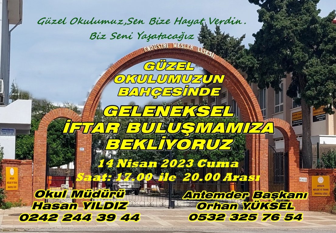 Mezunlar Derneğimiz ANTEMDER'in Geleneksel Etkinliklerinden İFTAR BULUŞMAMIZ bu yıl da Muratpaşa Belediyemizin Desteği ile Okul İdaremiz ve Derneğimiz işbirliğinde 14 Nisan 2023 Cuma günü Okul Bahçemizde gerçekleştirilecektir..