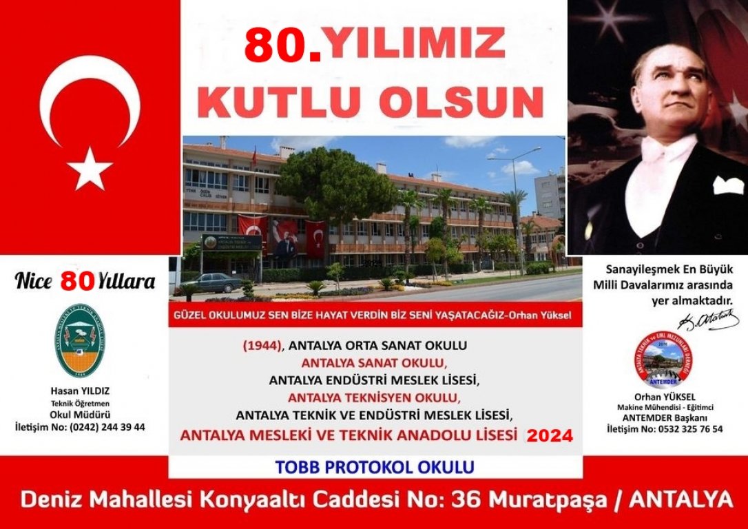 Antalya’nın 1944 yılında açılmış ilk Meslek Okulu olan, okulumuzun Mezunlar Derneği ANTEMDER’in gelişerek büyütülmesi için, Üyelerimizi, Mezunlarımızı, öğretmen ve öğrencilerimizi, okulumuzu seven tüm dostlarımızı GENEL KURULUMUZA ÇAĞIRIYORUZ. SEVGİLERİMİZLE 14.12.2023
